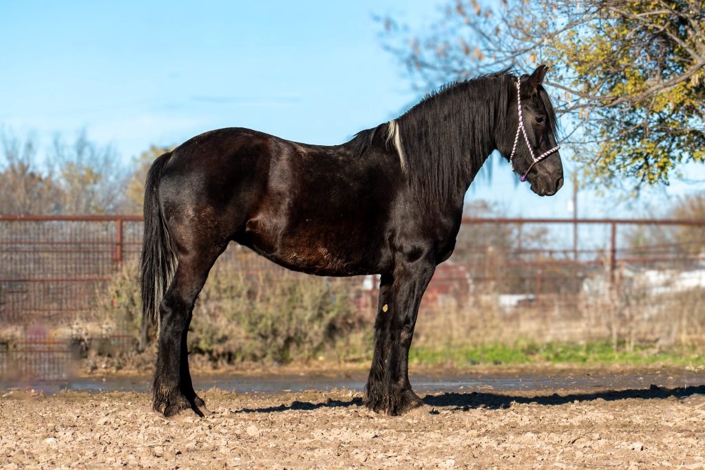 Nyx is a 2019 grade Friesian, mare, standing 16.2-3hh. Nyx is a gentle giant who is a complete sweetheart! Shes the fanciest mover around, and has the best manners.